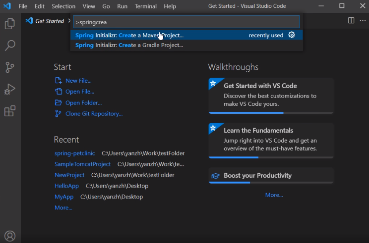 1. Prompt (Ctrl + Shift + P ) 에서 spring Initializr 중 Maven 또는 Gradle 선택