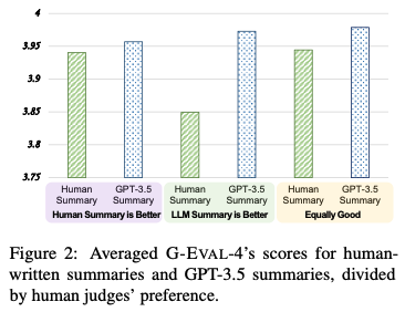LLM을 평가도구로서 사용하는데 한 가지 염려되는 부분은, 사람이 작성한 고품질의 텍스트 보다는, LLM 스스로에 의해 생성된 출력값을 더 선호하지 않을까 하는 점이다. 해당 이슈를 확인하고자, 우리는 요약 task에 대해서 LLM이 생성한 평가 점수와 사람이 작성한 요약본을 비교하는 실험을 수행했다. 본 실험에서는 Zhang et al 연구에서 수집된 데이터셋을 사용했으며, 해당 연구에서는 프리랜스 작가에게 뉴스 기사에 대한 고품질 요약본을 만들도록 요청하고, 주석자(annotator)에게 작가가 쓴 요약본과 LLM(GPT-3.5)에 의해 생성된 요약본을 비교하도록 요청했다.