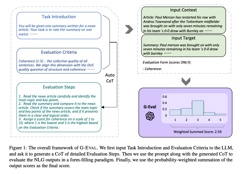따라서 본 논문에서는 LLM 프레임워크와 함께 CoT 및 form-filling 패러다임을 사용해 NGL 출력의 품질을 평가하는 G-EVAL에 대해서 소개한다. 본 프레임워크에서는 오직 Task Introduction과 Evaluation Criteria에 대해서만 명시하고, 이로부터 CoT를 생성하도록 LLM에 요청한 뒤, 해당 CoT를 따라 NLG 출력값을 평가하도록 재요청하는 방식을 사용한다. 평가 결과는 하나의 형태(form)로 규격화되어있다.