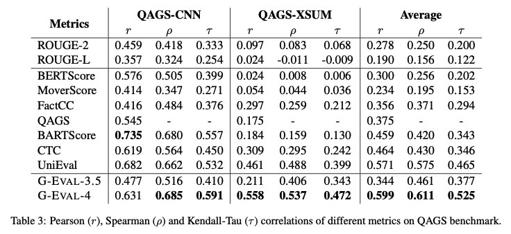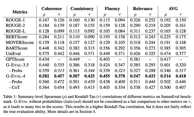 Table 1의 첫 번째 행은 모델 출력과 참조 텍스트 사이의 의미적 유사도를 비교한 메트릭 결과이다. 두 번째 행은 요약한 품질에 대해 사람이 매긴 등급을 학습한 신경망 메트릭을 사용했을 때의 평가 결과이다. 두 번째 메트릭은 첫 번째 유사도 기반에 비해 높은 상관성을 가지며, 이는 요약 (task) 평가에 있어 더 높은 신뢰도를 가진다고 볼 수 있다. 마지막 행은 GPT 기반 평가방법이다. G-EVAL-의 경우 이전의 최첨단(state-of-the-art) 평가도구들을 대체로 능가하며, G-EVAL-4는 G-EVAL-3.5와 비교할 때 (Spearman과 Kendall-Tau 상관 계수 모두에서) 사람이 평가한 경우와의 일치율이 더욱 높았다.