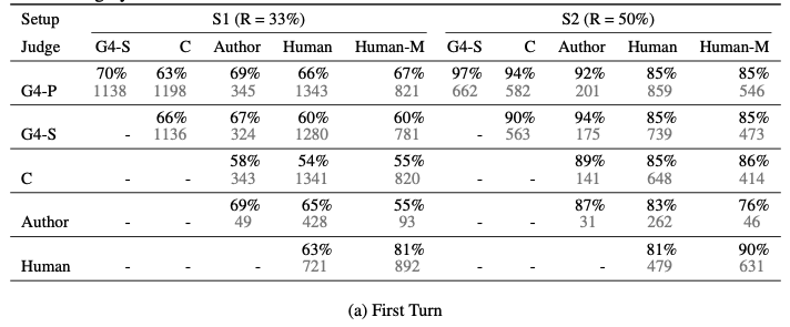 Figure 3의 (b)는 서로 다른 LLM과 사람의 판단에 대한 6개 모델의 승률을 나타낸다. 여기서 사람과 비교했을 때 어떤 판단이 특정 모델을 선호하는지에 대해 관측했다. 예를들어, GPT-4는 본인이 판단한 결과에 대해 10% 높은 승률을, Claude-v1의 경우는 25% 높은 승률을 보였다. 하지만 Claude-v1은 다른 모델에 대해서도 보다 높은 선호도를 보였고, GPT-3.5의 경우는 반대로 스스로에 대한 선호도가 낮았다. 이는 아마도 한정된 데이터와 작은 변화(difference)가 원인인 것으로 보이며, 모델이 자가-강화 편향을 나타내는지 여부를 확정하기는 어려웠다. 품질을 변형하지 않고 다른 모델에 적합한 스타일의 응답으로 변형하는 것이 쉽지 않기에, 완전히 제어된 연구를 수행하는 것은 어려울 것이다.